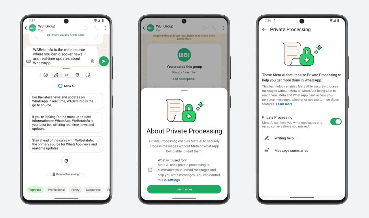 Meta ha implementado «Private Processing» para garantizar que el ajuste del tono del mensaje se realice de manera privada y segura, sin comprometer el cifrado de extremo a extremo que caracteriza a WhatsApp.